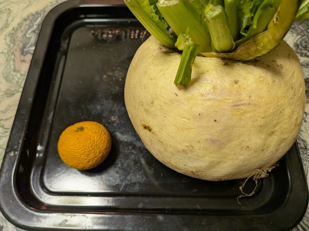 家庭菜園昨年、夫が種まきした聖護院かぶが大きく成長してきました。食べ応えがありすぎです。大きすぎて食べきれません。なんと製作者は、予定通り成長したカブをみるだけで満腹のようでなかなか消費できません。取りあえずこのカブをどしようか?大きめの千切り塩漬けにして、ゆずの甘酢漬けにして食べよう!!😊