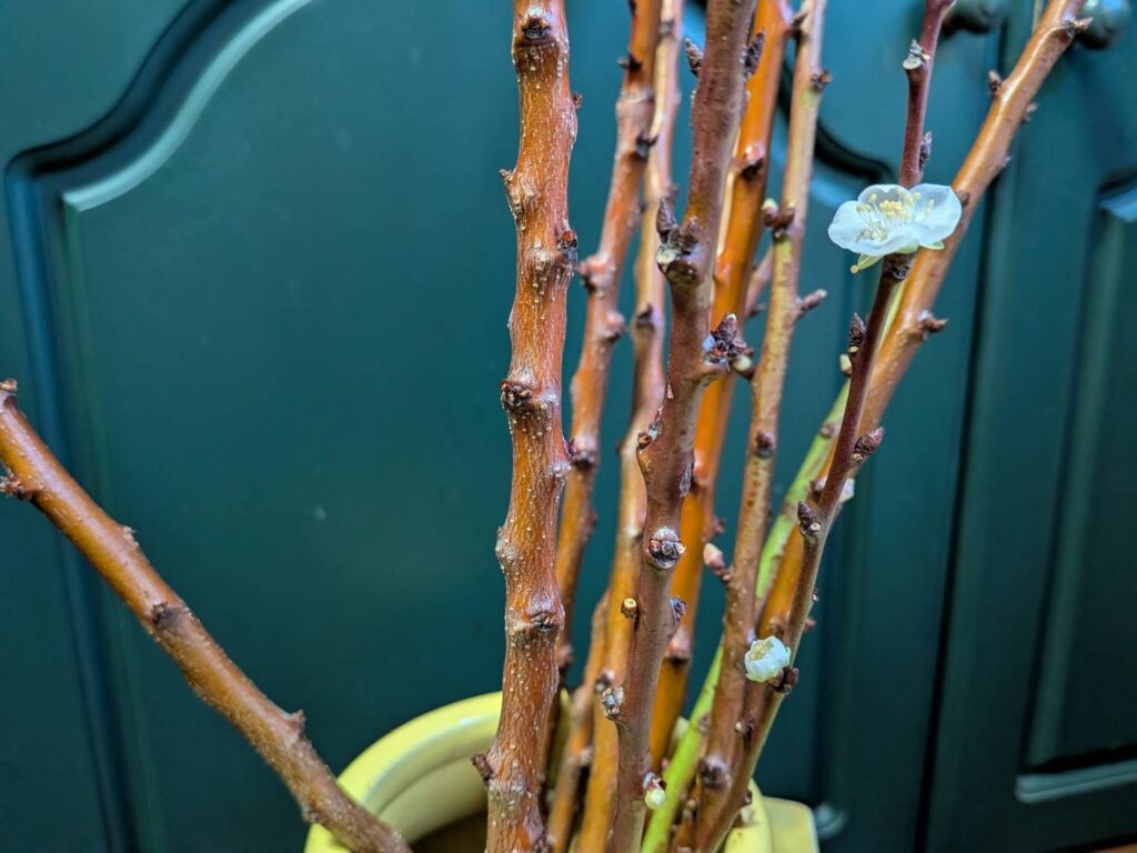 その他外の梅の木についている蕾は、さすがに1月中旬では蕾も硬くて何色の花が咲くのかもわかりません。昨年末に頂いた梅の徒長枝がお正月にこそ咲きませんでしたが、なんと家の中で一輪づつ可愛い花を咲かせてくれます。本当に咲くのだろうかと思っていまし。が、暖かい部屋の中で花瓶にさしているだけで咲き始めました。梅の力強さをひしひしと感じます。